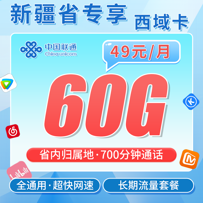 - 首月49元月租全价扣除,套餐内容全量到账;第2个月起49元包60G全国通用+700分钟新疆省内通话