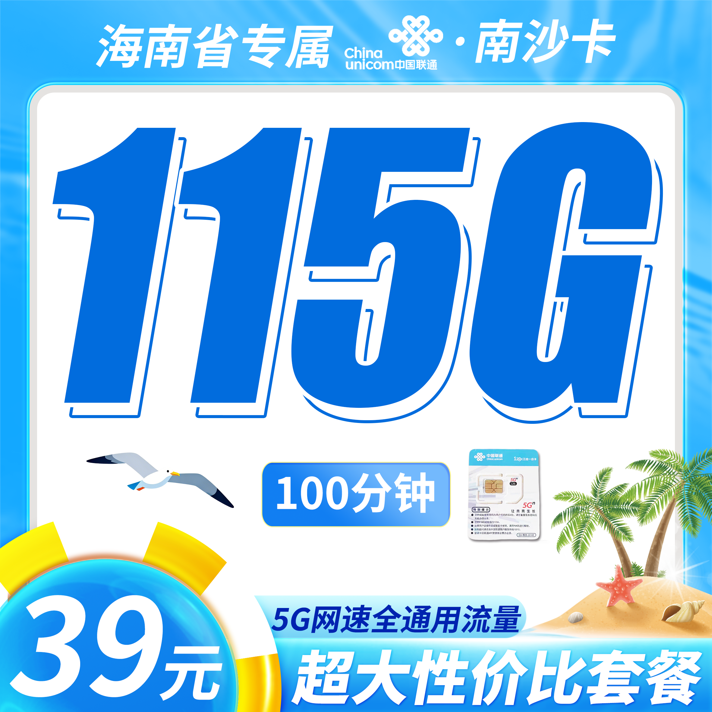 联通南沙卡39元115G+100分钟+海南专属!