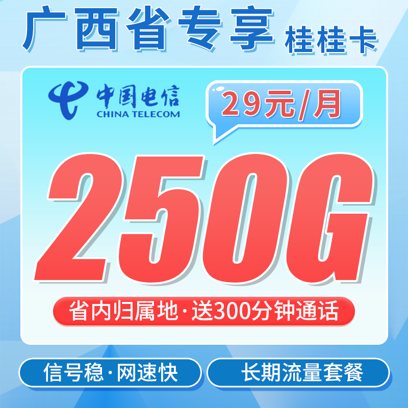 电信桂桂卡29元250G全国流量+300分钟+广西专属!