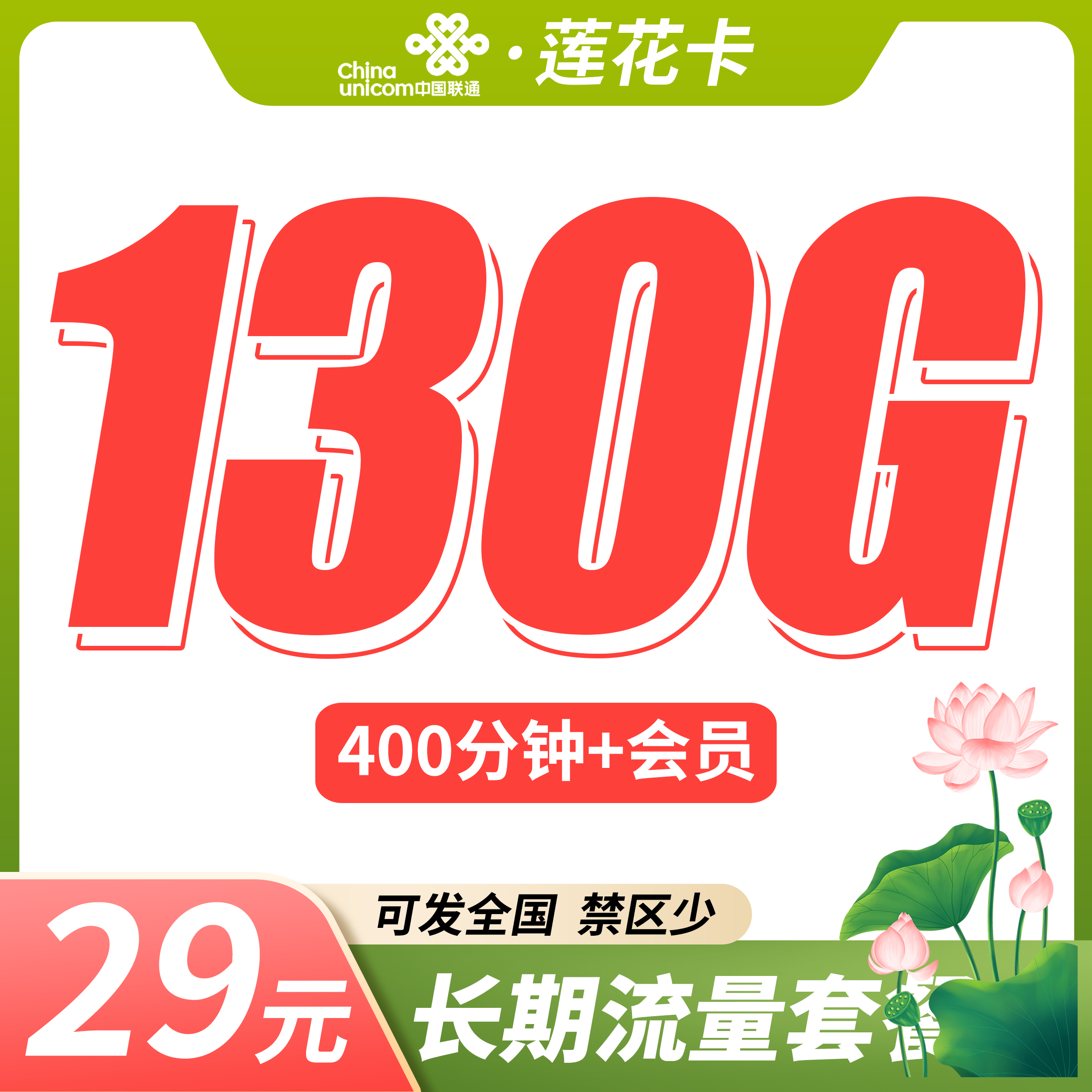 联通莲花卡29元130G+400分钟+可发全国!
