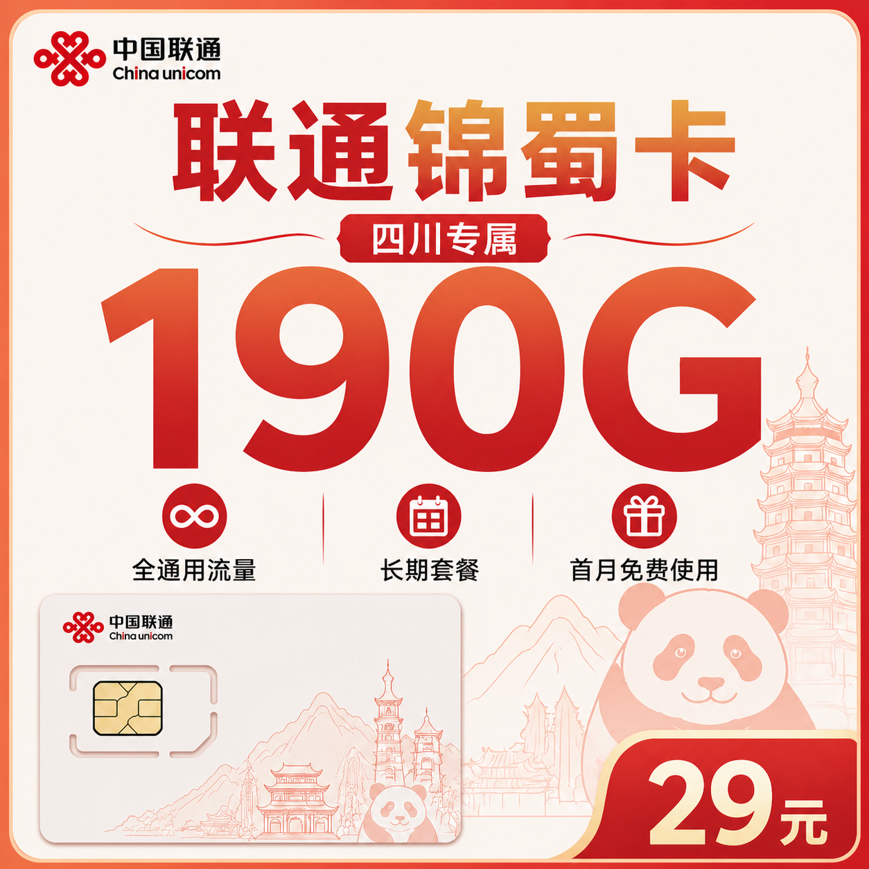 联通锦蜀卡29元190G+长期套餐+四川专属!