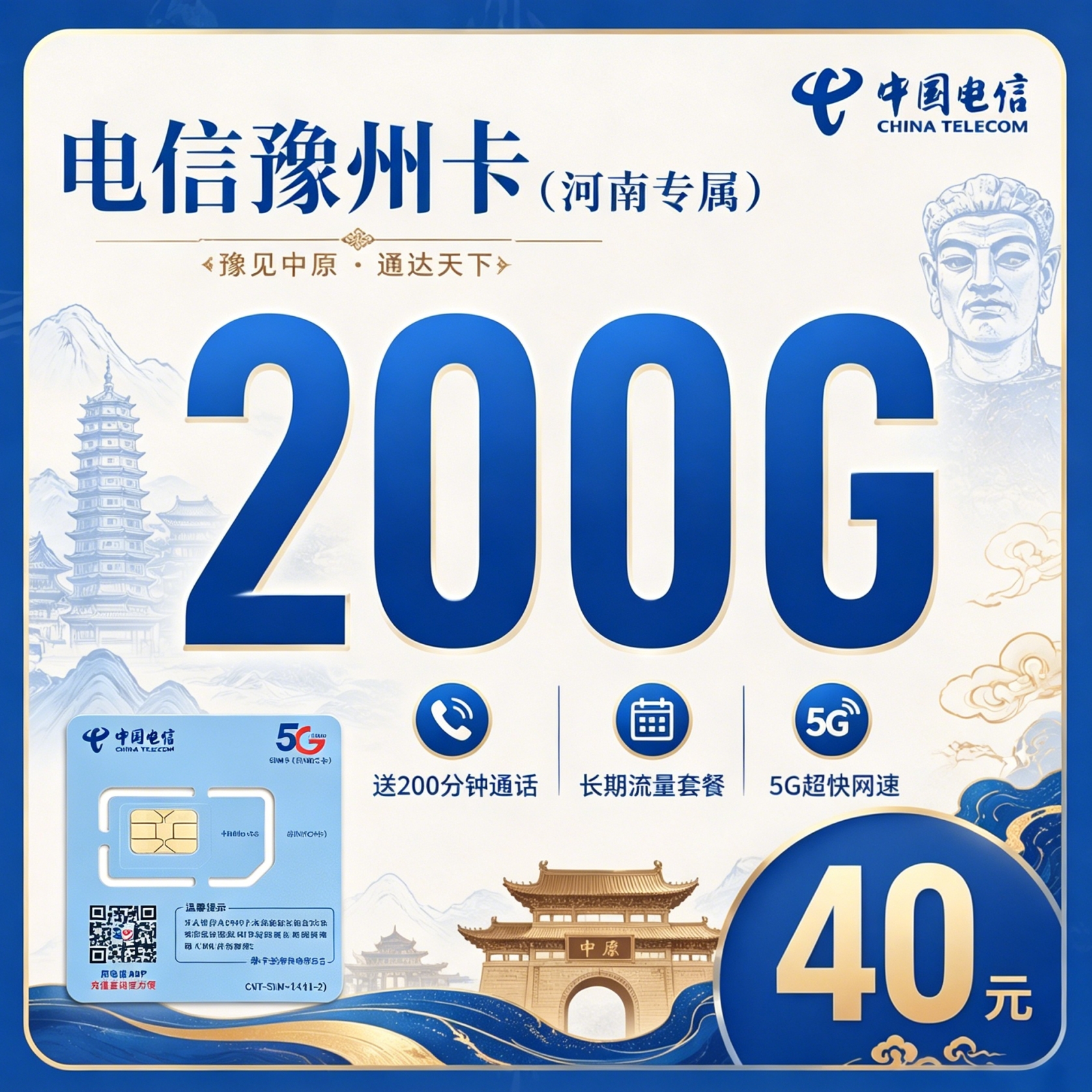电信豫州卡40元200G全国流量+200分钟+河南专属!