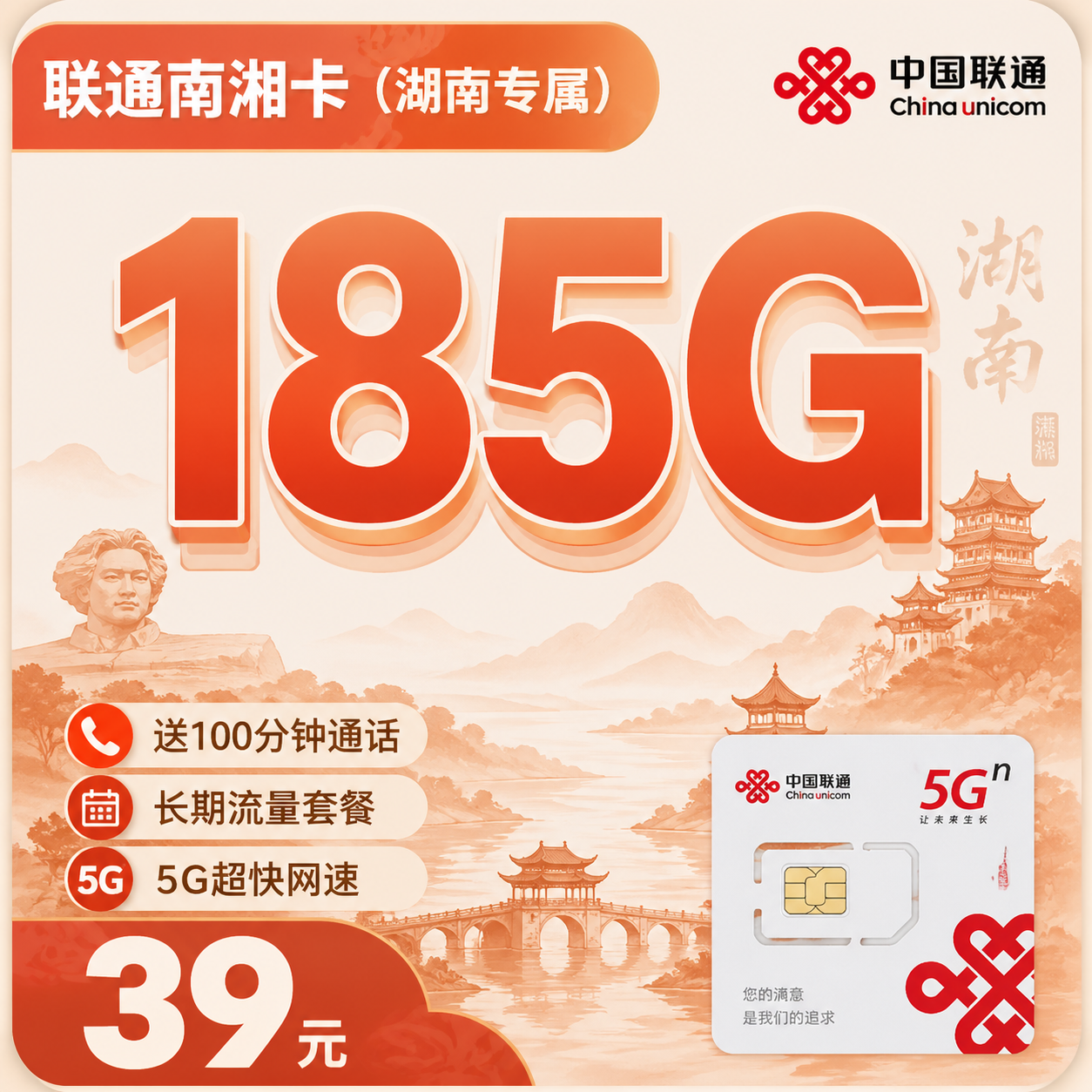 联通湖湘卡39元185G+100分钟+湖南专属!
