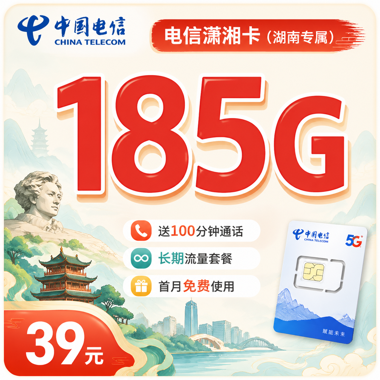 电信潇湘卡39元185G全国流量+长期套餐+湖南专属!