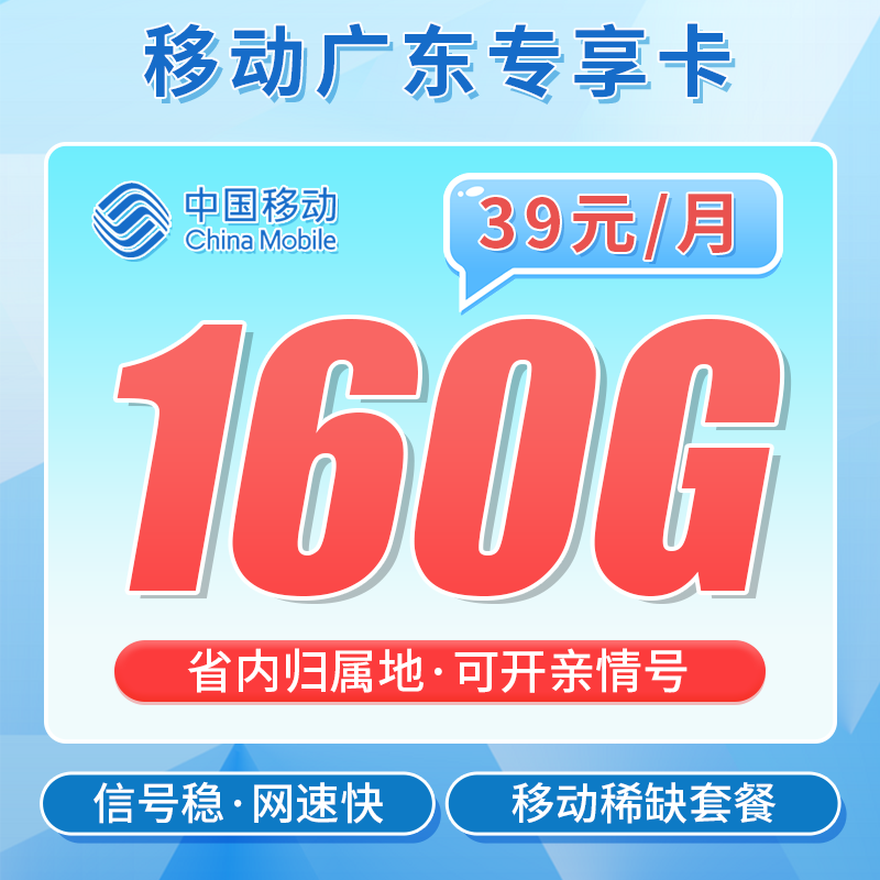移动广东卡39元160G+100分钟+广东专属!套餐构成首月39元按天折算,套餐全部到账 2.深圳第2-24个月39元180G通用+30G定向+100分钟 3.广州第2-24个月39元130G通用+30G定向+100分钟 4.惠州第2-24个月39元包150G通用+30G定向+100分钟 5.佛山第2-24个月39元包150G通用+30G定向+100分钟 6.东莞第2-24个月39元包145G通用