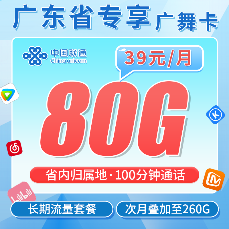 联通广舞卡38元80G+100分钟+广东省专属!套餐构成首月免费,套餐为80G按天折算;次月套餐变更为38元230通用+30定向+100分钟(长期)归属地广东不发地区仅发广东配送方式京东/顺丰激活方式快递激活首充渠道快递处首充100元办理年龄18-60岁违停复机中国联通APP二次实名认证或到营业厅办理认证套餐合约3个月合约注销方式支持异地注销、营业厅注销,合约期内注销有违约金,违约金=(原套餐月租