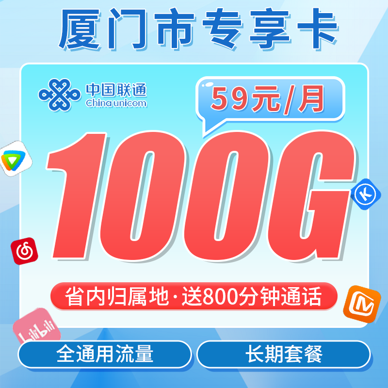 联通厦门卡59元100G+800分钟+厦门专属!套餐构成首月15号前激活全额扣费;15号后激活半月扣费;长期59元100G全国通用+800分钟 归属地厦门不发地区只发厦门市配送方式京东快递激活方式上门激活首充渠道交付人员处充值200元办理年龄18-60岁违停复机-套餐合约12个月合约注销方式支持异地注销、营业厅注销,合约期内注销有违约金,违约金=(原套餐月租-当前月租)×已履约月份,如有变动以官方为准