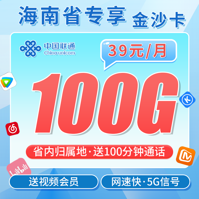 联通金沙卡39元100G+100分钟+会员权益+海南专属!